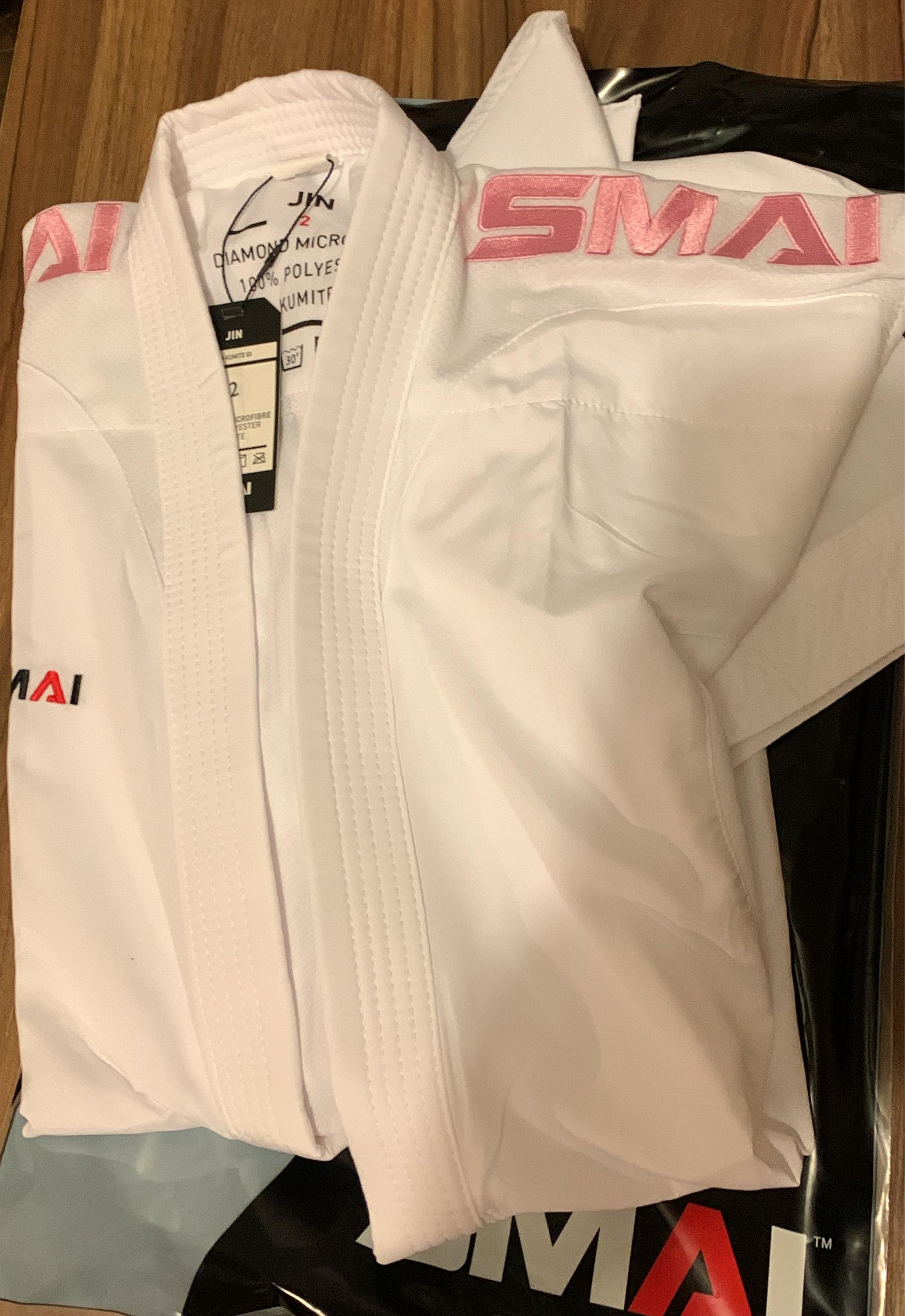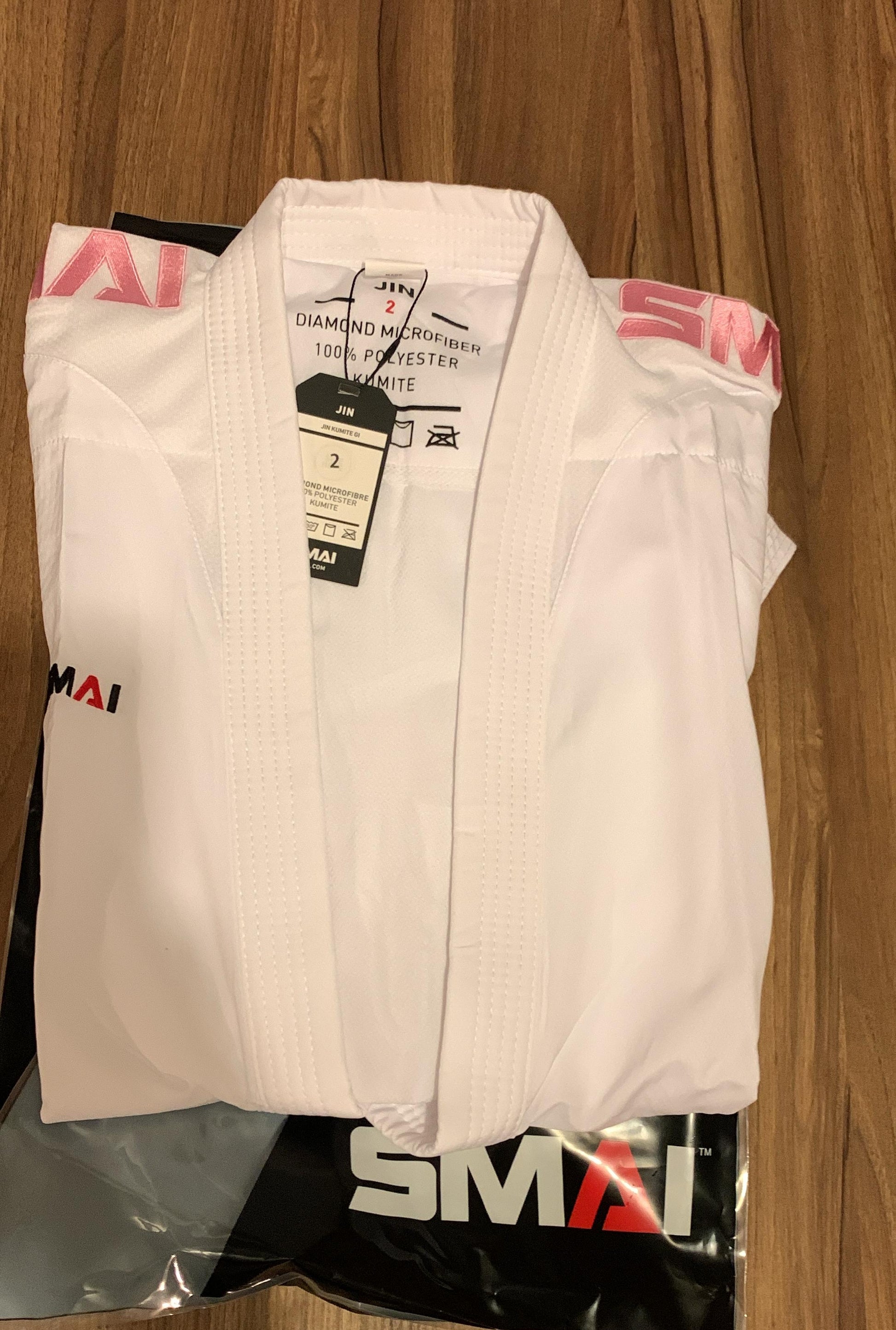El nuevo y brillante gi de kumite de SMAI color rosa.